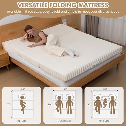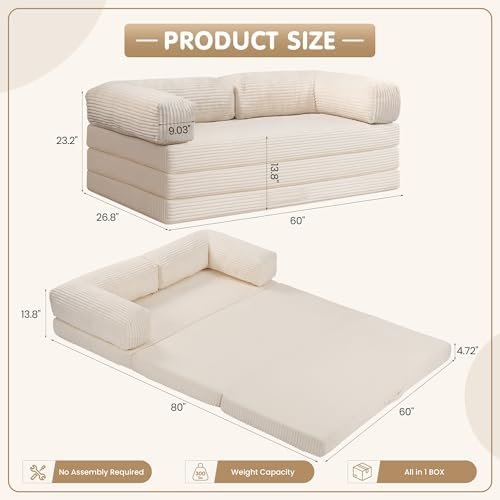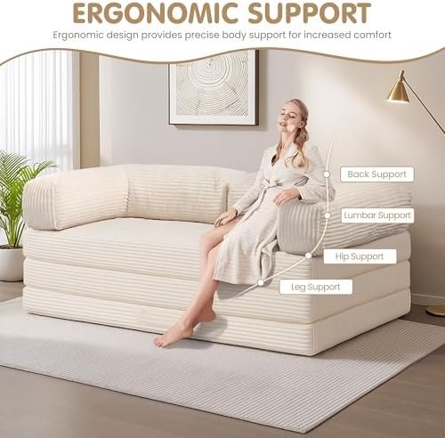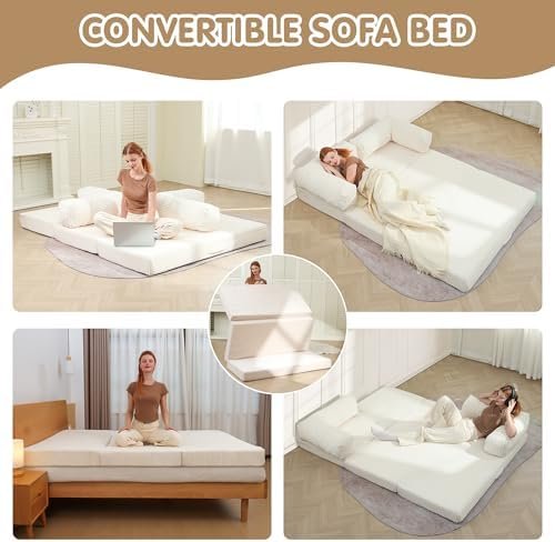 ✨️THOUGHTFUL DESIGN – This folding sofa bed features ergonomic armrests and cloud-like cushions with 30D high-resilience memory foam for superior support. The zippered design allows adjustable layouts. A hidden handle enables easy folding, while the non-slip base ensures stability. The removable, machine-washable cover simplifies cleaning. The space-saving tri-fold design is ideal for small apartments, offering high comfort and versatility.