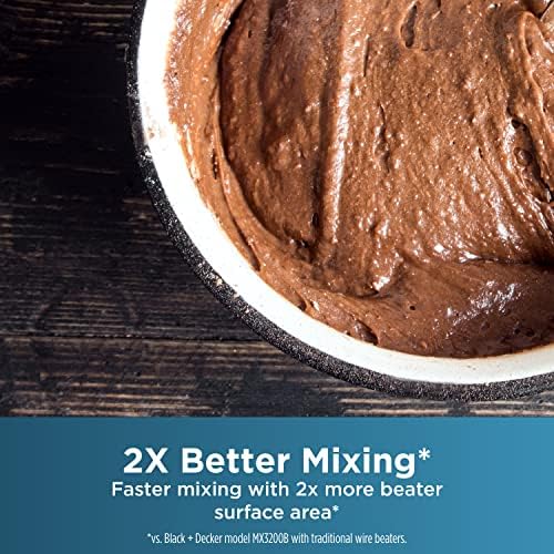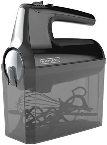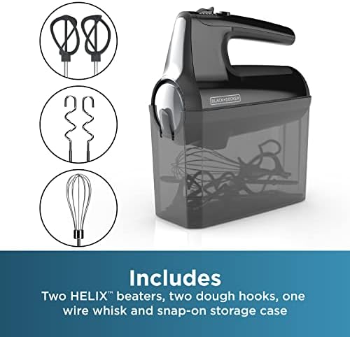 Premium design from BLACK+DECKER. The advanced helix design improves mixing performance* by maximizing beater overlap and mixing ingredients in multiple directions. The BLACK+DECKER Helix Performance Premium Hand Mixer features reinforced nylon beaters with 2x the surface area* and 2x the mixing performance*. With 350 watts of power at peak performance** runs at five speeds, including a reduced* starting speed to help prevent splatters. Plus, a special turbo boost adds a power boost at every mixing speed to combine thick ingredients in no time. This set includes two helix beaters, two dough hooks, and one wire whisk; allowing you to quickly create cake and cookie batters, bread doughs, spreads and dips, homemade whipped cream, or whipped egg whites for a tasty meringue. All accessories are stored conveniently in the smartly designed storage case, which uses the mixer itself as the snap-on cover. Cleanup is a breeze with the auto-eject button that quickly disconnects the dishwasher-safe mixing tools. Plus, you can further prevent messes with the heel and bowl rest, which allows the mixer to sit upright on the edge of the bowl. *compared to BLACK+DECKER model MX3200B with traditional wire beaters **Peak power refers to the maximum power recorded for 100ms during blending.