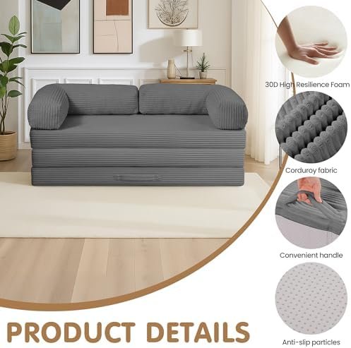 ERGONOMIC COMFORT DESIGN – This folding sofa bed features cloud-like cushions with 30D high-resilience memory foam for superior support and elasticity. The zippered, removable L-Shaped Armrests and machine-washable cover offer effortless cleaning, while the hidden handle and non-slip base ensure easy transformation and stability. Its practical tri-fold design maximizes space in studio apartments and tiny homes.