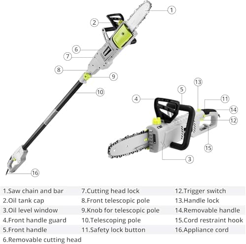 POWERFUL MOTOR PERFORMANCE: This 8-amp corded pole saw features an 10-inch chain and bar, powered by a pure copper motor with a speed of up to 6500 RPM.Its exceptional performance and consistent reliability make it an ideal choice for trimming branches.