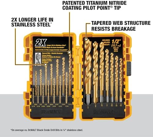 Featuring heavy-duty titanium nitride coating PILOT POINTs that start on contact and helps to prevent walking, the DEWALT includes commonly used bits for a range of metal and wood-drilling applications. No-spin shanks helps to prevent bits from slipping, and a tapered web delivers helps to increased durability to helps to reduce breakage. A durable carrying case keeps bits organized and ready to go.