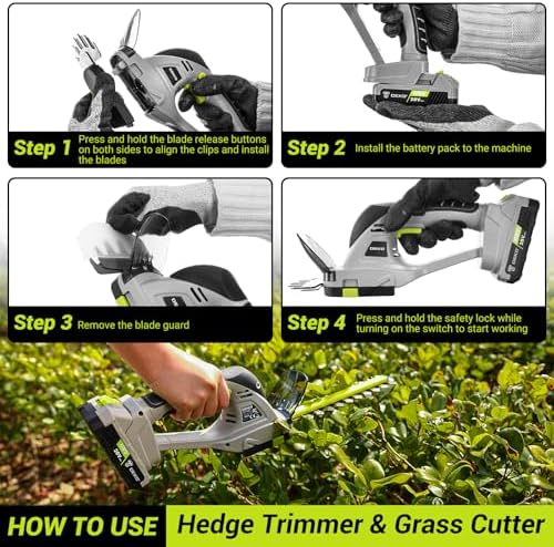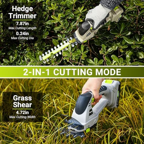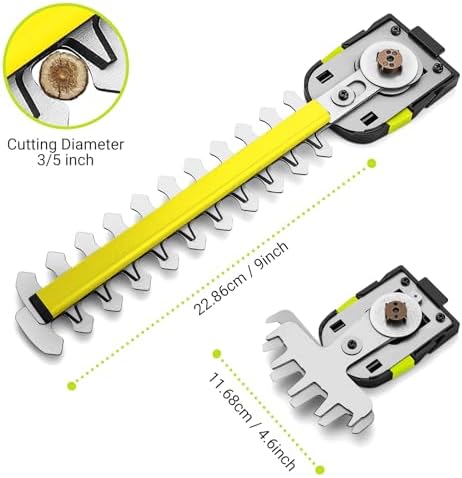 Dual-Function Design: LURSKY’s electric hedge trimmer and grass shear boast a seamlessly integrated design. With blade release buttons enabling effortless transitions between functions, the 4.6-inch blade is tailored for lawn maintenance (max cutting thickness 3/8in.), while the 9-inch blade (max cutting thickness 1/4in.) excels at precise trimming of hedges and shrubs