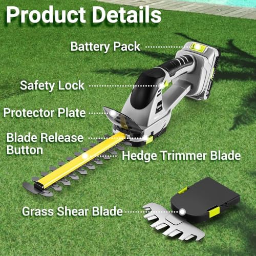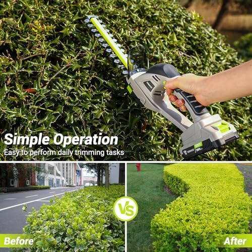 Rechargeable and Durable Trimmer: Equipped with 20V battery and charger, DEKOPRO hedge trimmers cordless with battery is convenient for outdoor cutting, 2000mAh battery keep it continuous operation. Besides, the maintainance is also easy: wiping the blade of grass cutter trimmer with clean cloth after use and keeping it put in a dry environment