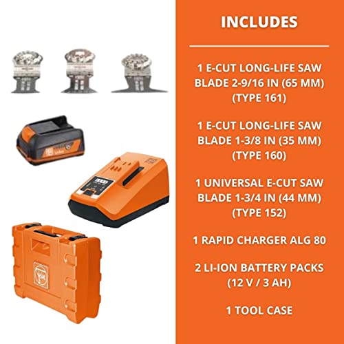 Durable Storage and Accessories Included – Includes a tool case, 2 E-Cut Long-Life Saw blades (type 160, 161), 1 Universal E-Cut Saw Blade (type 152), 2 Li-ion battery packs (12 V / 3 Ah), and a rapid ALG 80 charger.