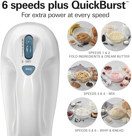 EASILY HANDLES A VARIETY OF RECIPES: With 6 different speed options plus a QuickBurst button for an extra burst of power when you need it, this electric hand mixer prepares every recipe with ease.