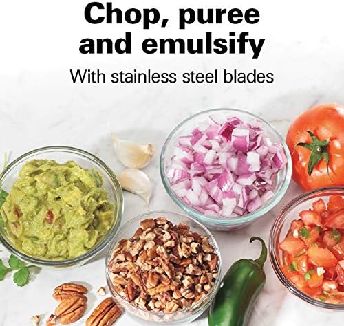 Easily chop, puree and emulsify with stainless steel blades: Durable stainless steel blades make easy work of a multitude of ingredients including onions, carrots and nuts. Oil dispenser on lid makes it easy to emulsify dressings, dips and sauces.