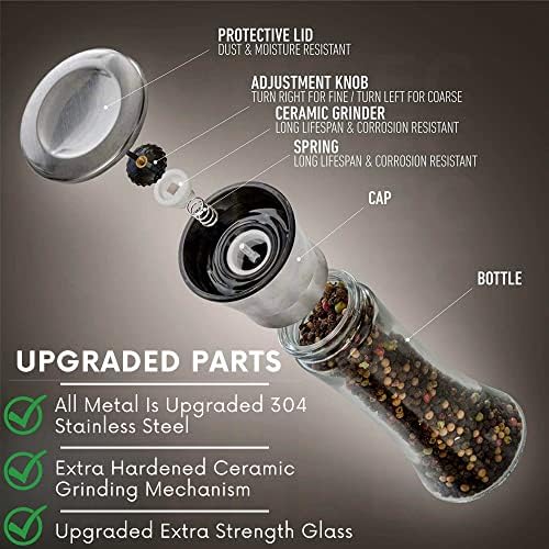 Easily Adjustable Ceramic Grinder : Our Salt and Pepper Shakers have a larger heavy duty ceramic rotor than competitors. Just twist the knob at the top of each salt and pepper shaker to set your desired coarseness of salt, pepper, or spice. An Authentic HOME EC salt and pepper mill pair and funnel arrive in Branded Packaging with a foam tray to protect your salt and pepper grinder mills! Chef Ebook will be emailed.