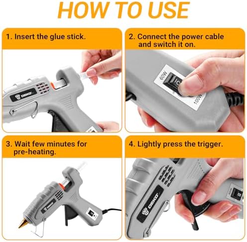 【High & Low Temp Settings】The hot glue gun offers dual power outputs to feed glue the way you need it. The simple power switch quickly adapts to all project temperatures.60W for craft projects and fragile materials.100W for wood and heavier materials.This glue gun has you covered.