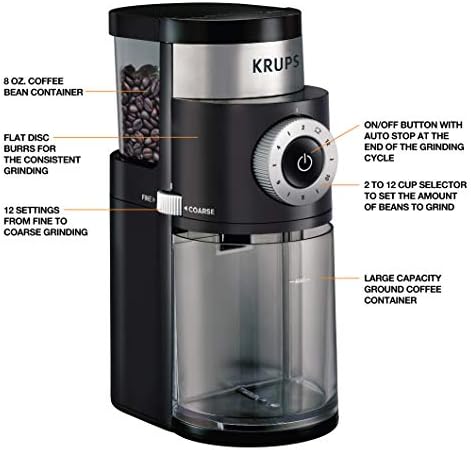 Elevate your coffee experience with the KRUPS Precision Burr Coffee Grinder. This versatile tool features 12 precision settings, allowing you to customize your grind size from fine to coarse, perfect for various brewing methods including drip coffee, french press, espresso, pour over, and cold brew. Powered by a 110-watt motor, the flat metallic burr mechanism ensures uniform grinding for consistent flavor extraction. The burr design preserves your coffee’s aromatic qualities by maintaining optimal grinding speed and minimizing heat build-up. With its 8 oz bean hopper and removable grounds container, this grinder can produce enough coffee for up to 32 cups, accommodating both individual servings and larger batches efficiently. User-friendly operation includes an intuitive on/off button with auto-stop function. Select the number of cups (2-12) for precise measurements, reducing waste. The removable top burr and included cleaning brush make maintenance simple. Constructed with durable stainless steel, this grinder is built to last and maintain consistent performance. Its sleek design complements modern kitchens while delivering professional-grade results at home. To use, select your desired grind size using the 12-point scale. For french press or cold brew, use a coarser grind; for drip coffee, choose medium; and for espresso, opt for fine. Always use fresh, whole beans for the best flavor. Fill the hopper, select the number of cups, and press start. For optimal flavor, grind your beans just before brewing. To clean, unplug the grinder, remove the top burr, and use the included brush to clean residual grounds. The removable grounds container can be washed with mild soap and water; ensure it’s dry before reassembling. KRUPS backs this grinder with a two-year warranty. Whether you’re a coffee connoisseur or just starting your journey into freshly ground coffee, the KRUPS Precision Burr Coffee Grinder delivers consistent, flavorful results with every brew.