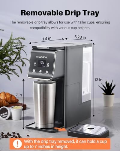【REMOVABLE DRIP TRAY】The removable drip tray allows for use with taller cups, ensuring compatibility with various cup heights. Holds up to 7” travel mugs to minimizes spills.