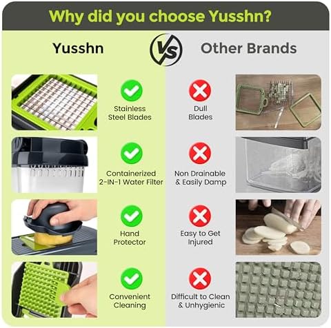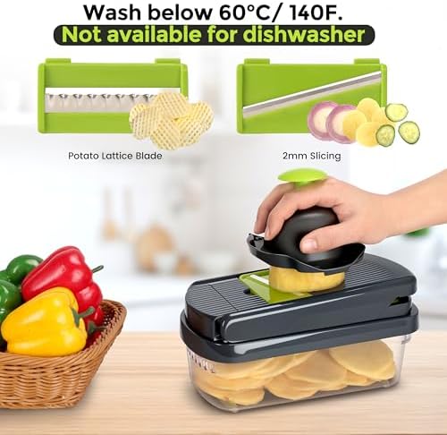 【CONTAINERIZED 2-IN-1 WATER FILTER】The latest upgrade integrates the water filter basket and container, streamlining the process of food cleaning and collection by eliminating the need for loading and disassembly. With a generous capacity, it is designed to accommodate chopped and diced ingredients efficiently. Constructed entirely from ABS material, this vegetable chopper boasts exceptional heat resistance, high hardness, and superior impact resistance. Wash below 60°C/140F.Not available for dishwashe