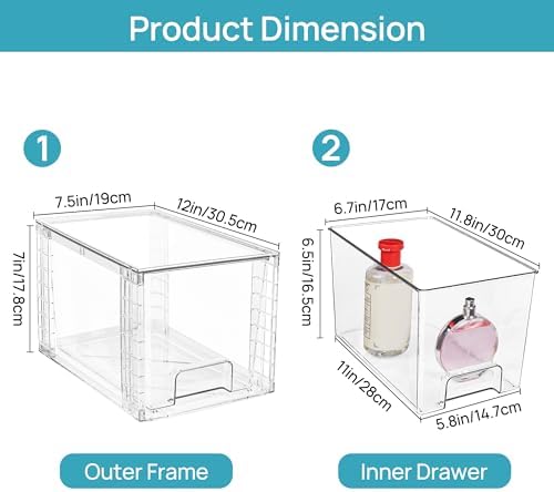 High Quality Acrylic Organizer–These storage bins are made by PET material, which is 12″L x7.5″W x 7″H, and the using size is 11″L x 5.8″W x 6.5″H. It can bear 15lbs when stacked